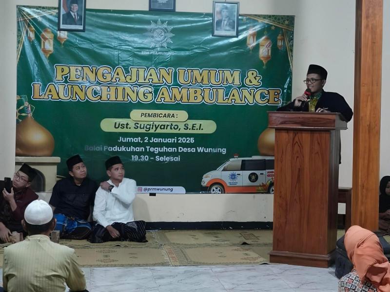 WUNUNG - Dalam upaya meningkatkan pelayanan kepada masyarakat, Pengurus Ranting Muhammadiyah (PRM) dan Pengurus Ranting Aisyiyah PRA Kalurahan Wunung hari ini Jum’at tanggal 2 Januari 2026 pukul 20.00 WIB bertempat di Balai Padukuhan Teguhan secara resmi meluncurkan armada mobil ambulance PRM dan PRA Wunung. PRM dan PRA Wunung berkomitmen melaksanakan kegiatan di bidang sosial kemanusiaan dengan partisipasi masyarakat relawan sebagai kekuatan organisasi, dan mempunyai kemampuan menanggulangi penderita kecelakaan dan darurat kesehatan, serta membantu mengevakuasinya ke fasilitas kesehatan yang ada. PRM dan PRA Wunung senantiasa mengembangkan kerja sama dengan mitra kerja, baik yang menyelenggarakan pelayanan kesehatan seperti puskesmas, balai pengobatan, poliklinik, rumah sakit, maupun penyelenggara pelayanan ambulans lainnya.